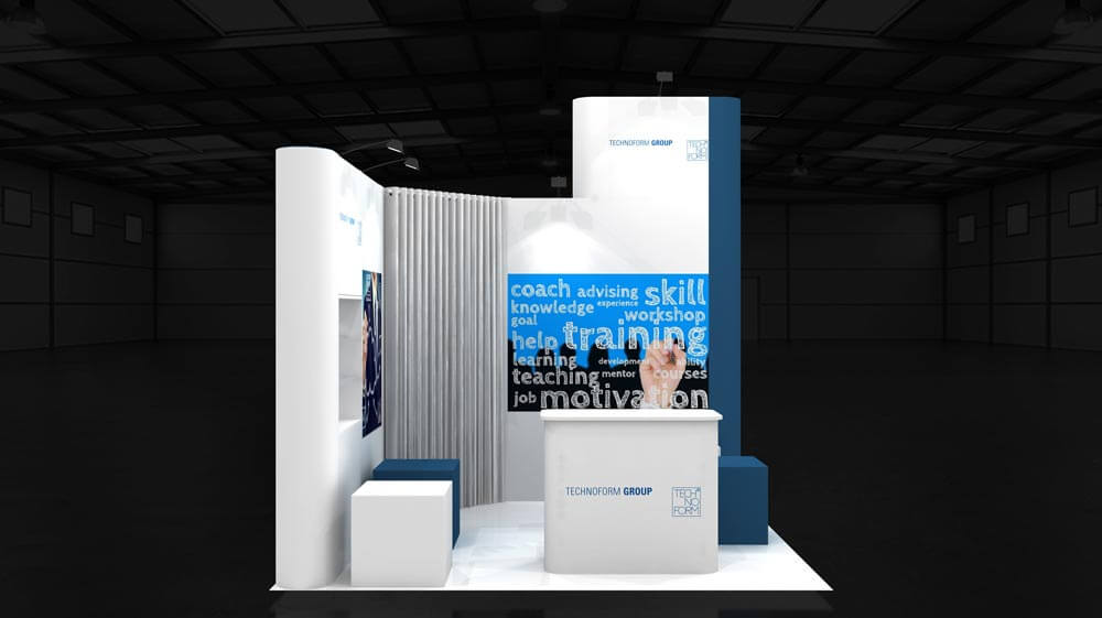 A compact and stylish 3×3 booth designed for quick setup and strong brand visibility.